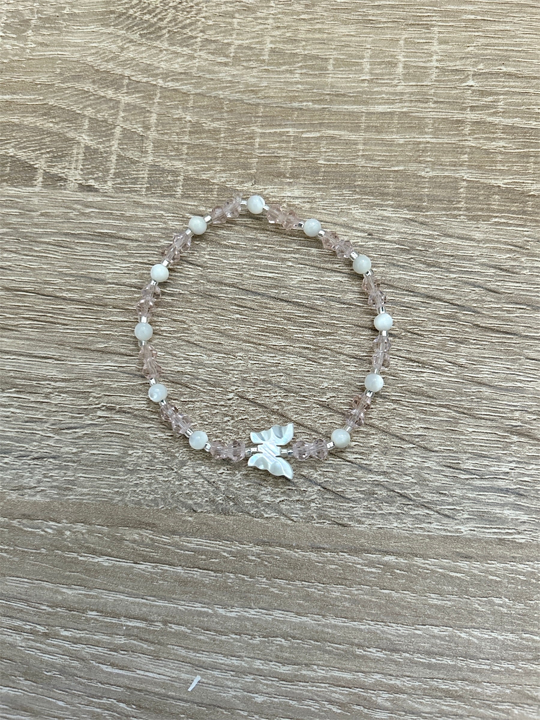 Made with pink glass beads and mother of pearl beads and butterfly.