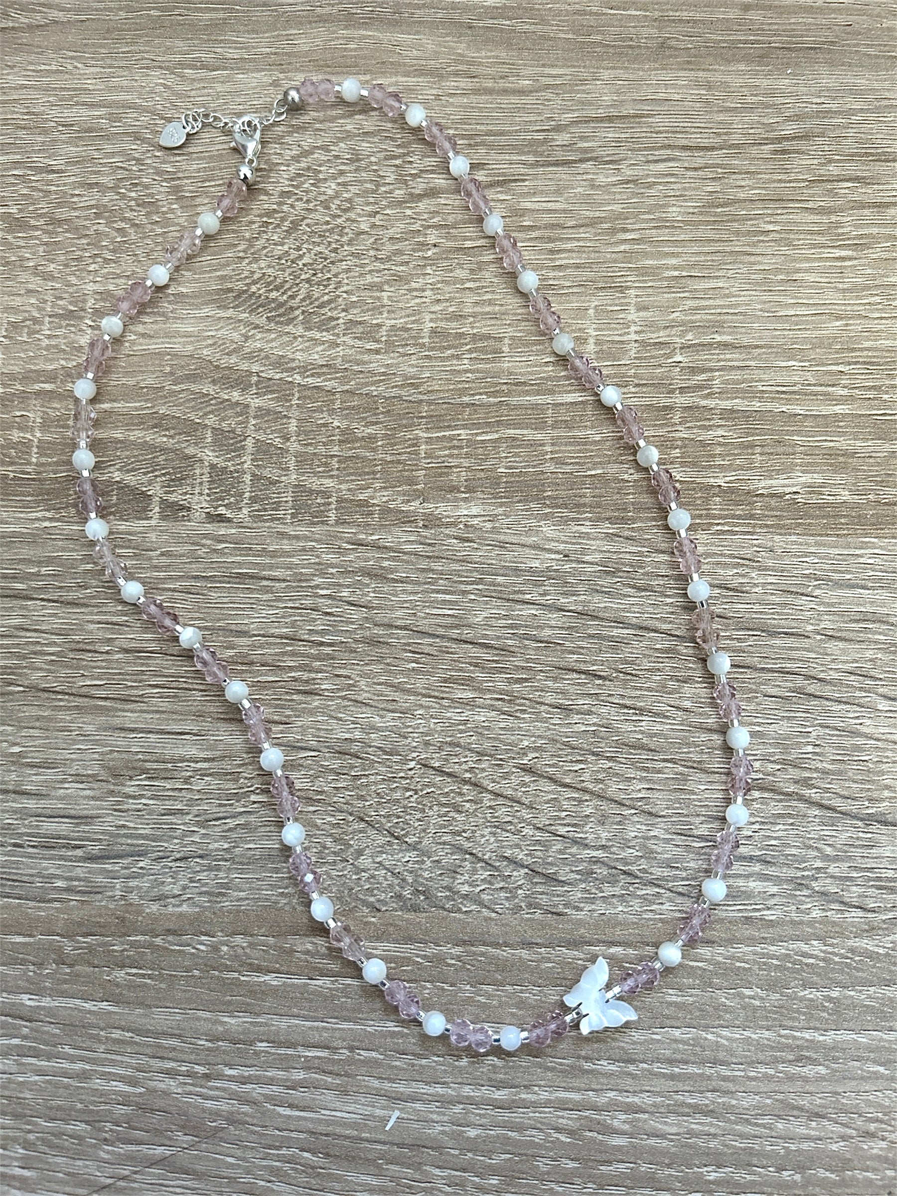 Made with pink glass beads, mother of pearl beads and butterfly.