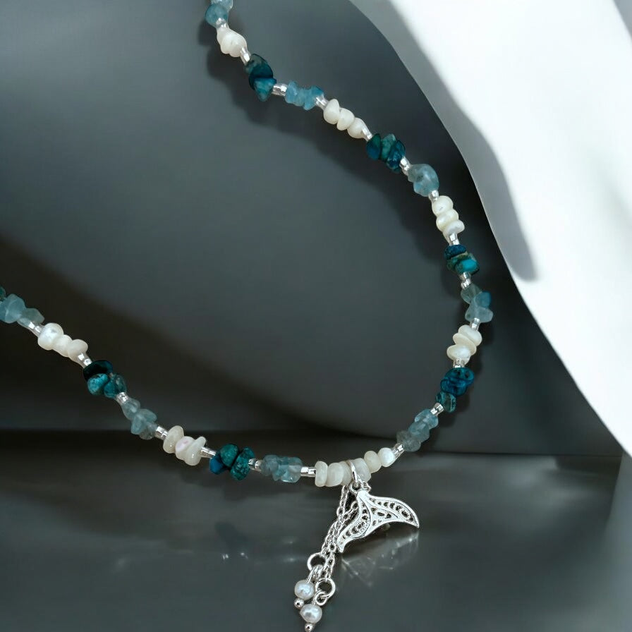 Made with mother of pearl, apatite & phoenix chip beads with 925 silver mermaid tail charm & fixings.