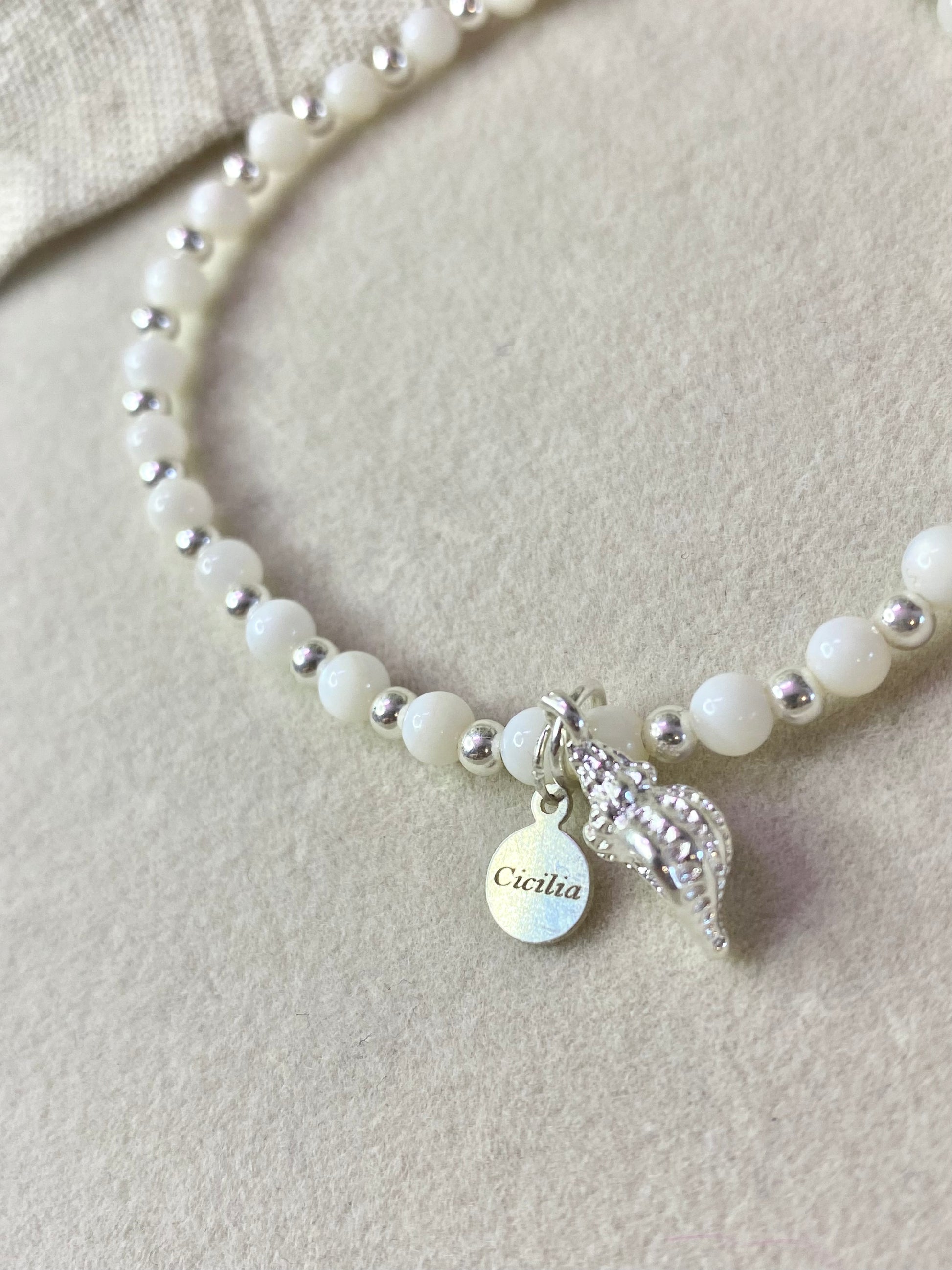 Made with mother of Pearl 4mm beads, sterling silver 3mm beads and sterling silver charm and Cicilia tag.