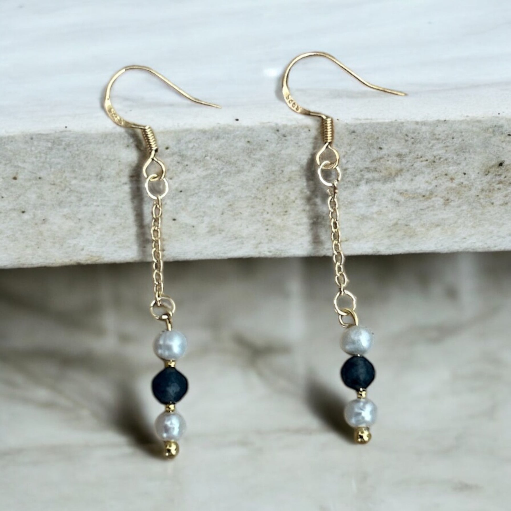 Sapphire and fresh water pearl on 925 gold plated earrings. Earring drop is 3.5cm long.