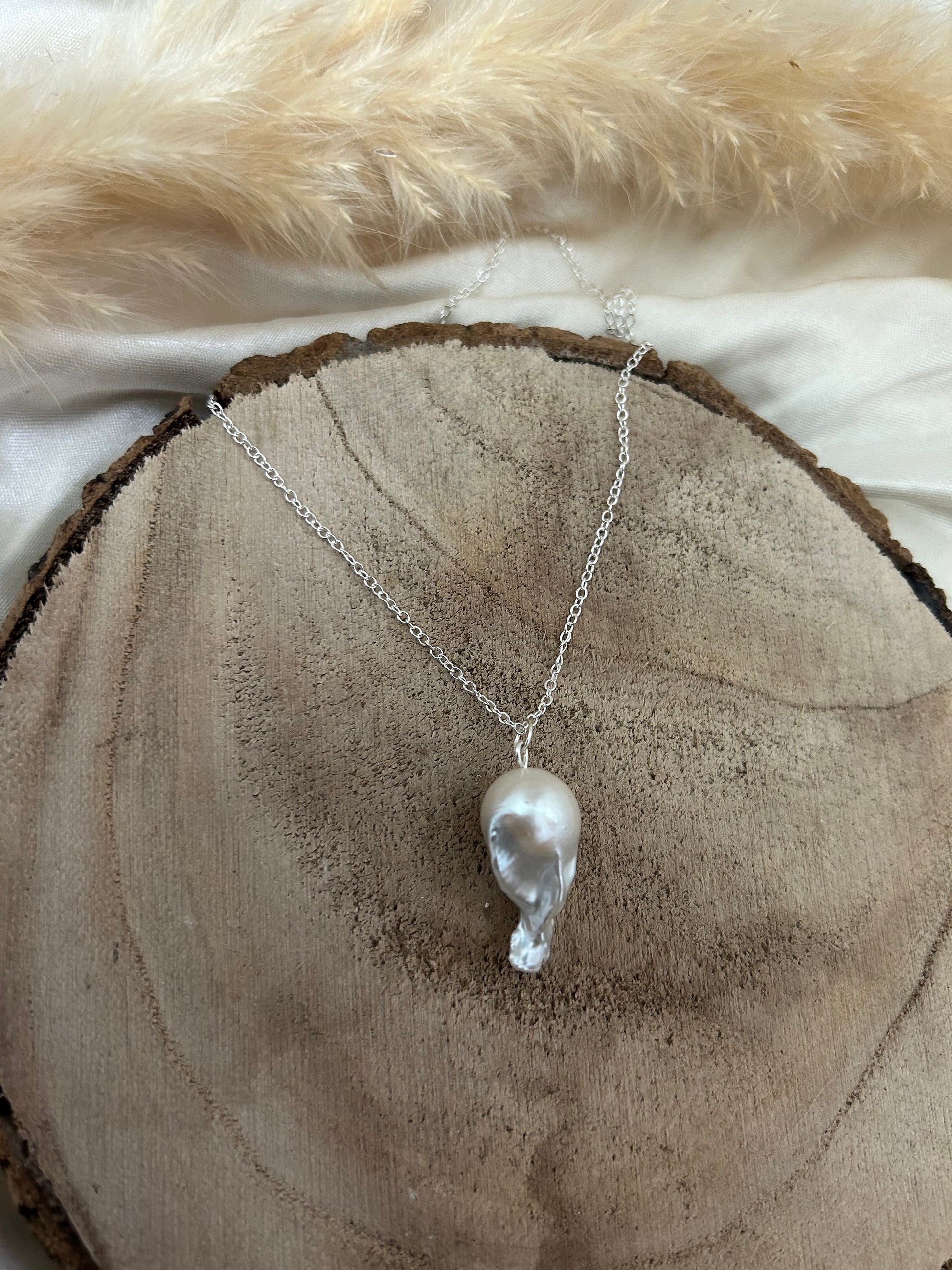 White baroque fireball pearl necklace on a 925 silver chain.